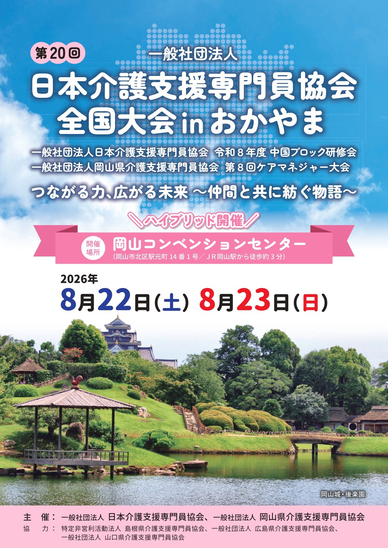 2021年8月28日、29日 日本介護支援専門員全国大会in山口が開催されます。2000年施行の介護保険制度は、「走りながら考える」と表現した言葉に象徴される通り、近年は人生会議、地域包括ケア推進、共生社会、介護離職防止などの社会的背景を持った課題も次々に提示され、介護支援専門員に課せられる職務内容は拡大の一方にあります。その反面、介護支援専門員の裁量は縮小され続けている実情があります。